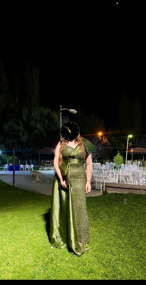 Uzatılmış, dar kesim abiye elbise; parlak haki, drapeli tasarım ve V yaka detaylıdır. İp askılı ve bohem tarzdadır, şık düğünler için uygundur. Sadece bir kere giyildi pazarlık yapılır