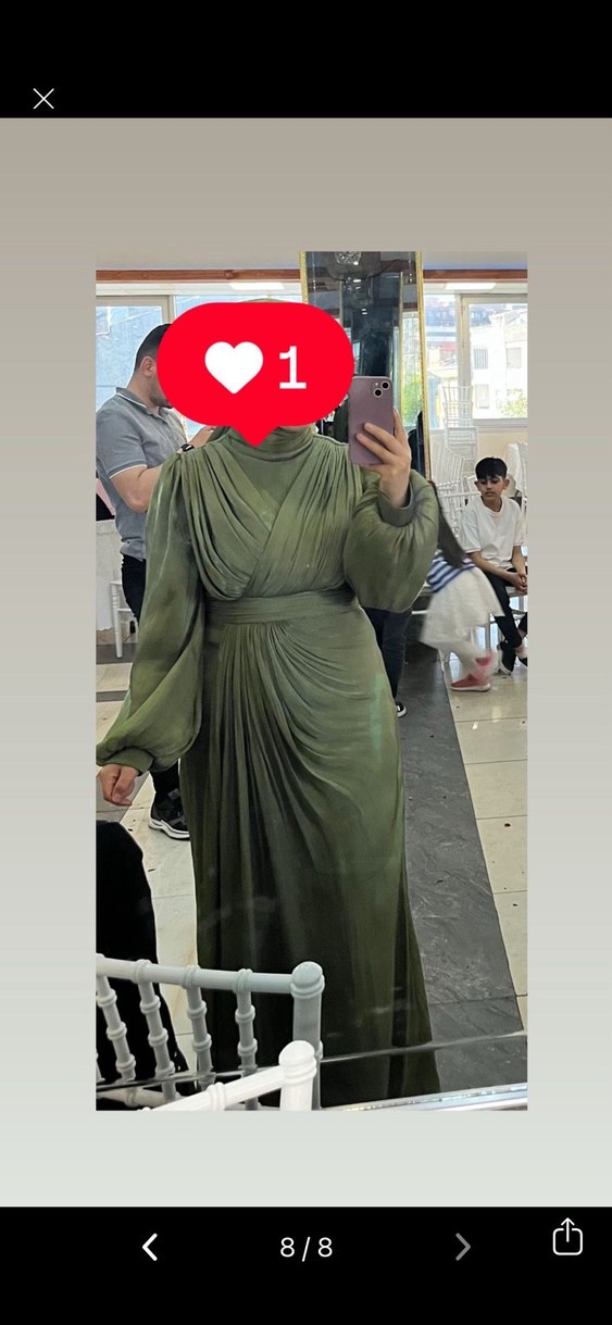 Koyu haki renkli, yüksek yakalı ve uzun kollu drapeli, bol kesim uzun abiye elbise. Mütevazı ve avant-garde stil için uygundur. Kol tarafında belli olmayan çizgi oldu bir kez giyildi