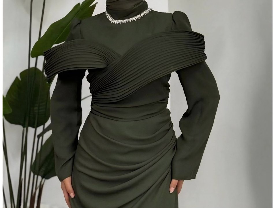 aşırı güzel bir elbise 1 kere giydim kuzenimin düğününde, herhangi bir kusuru yok sıfır ürün şalıyla beraber satıyorum şalını özel diktirdim (ton tutturmakta zorlandım uzun uğraşlarla buldum sadece şal 700 e mal oldu bone için kumaş parçasıda var) abiyeyi de 4000 bin civarına aldım..tereddüt etmeden alabilirsiniz harcadığım miktardan çok daha uyguna koydum yinede tekliflere açığım Uzun haki renkte, drapeli tasarımlı, kayık yaka ve uzun kollu kadın elbisesi. Ofis için uygun, minimalist ve çağdaş stilde, regular fit.