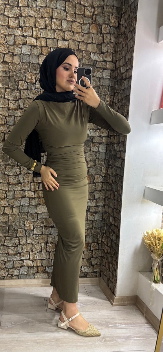 Kadınlar için dar kesim, yüksek yakalı ve uzun kollu, düz haki renkte sentetik kumaştan yapılmış, drapeli uzun elbise. Günlük sokak stiline uygun.