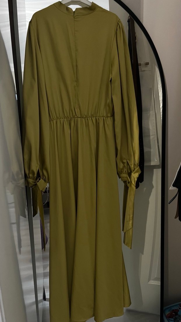 Haki renkte, yüksek yakalı ve uzun kollu drapeli uzun elbise. Yumuşak sentetik kumaştan, bol kesimlidir ve ofis için avant-garde sokak stili sunar.