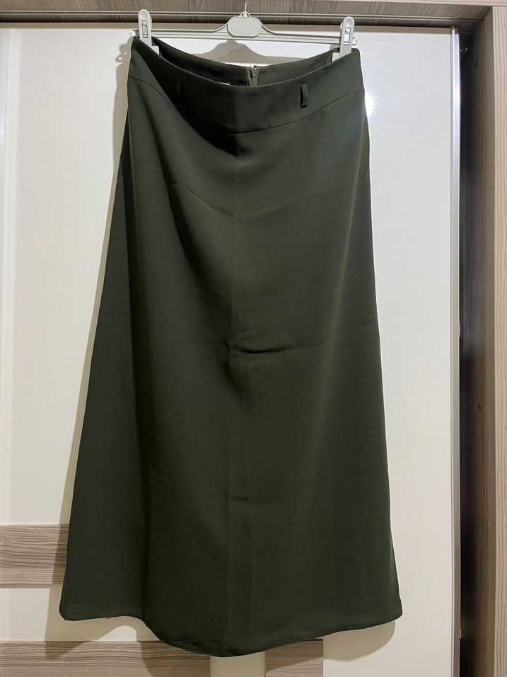 Kadınlar için koyu haki renkte, drapeli tasarıma sahip uzun etek. Düzgün sentetik kumaştan üretilmiş, ofis ve minimalist stile uygun regular fit.