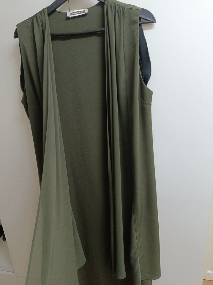 Kadın haki renkli, drapeli ve kolsuz uzun yelektir. Straplez yakalı, bol kesim ve yumuşak sentetik kumaştan yapılmıştır. Günlük kullanıma uygundur.