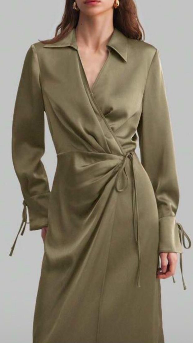 Kadın Haki Uzun Drapeli Saten Gömlek Elbise
