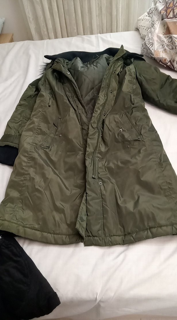 Kadın haki uzun ceket, düğmeli ve notalı yaka detayına sahip. Sentetik kumaştan üretilmiş, bol kesim ve uzun kolludur. Dış mekan kullanımı için uygundur. fermaur yapılması gerekiyor sadece onun dışında bir sorunu yok