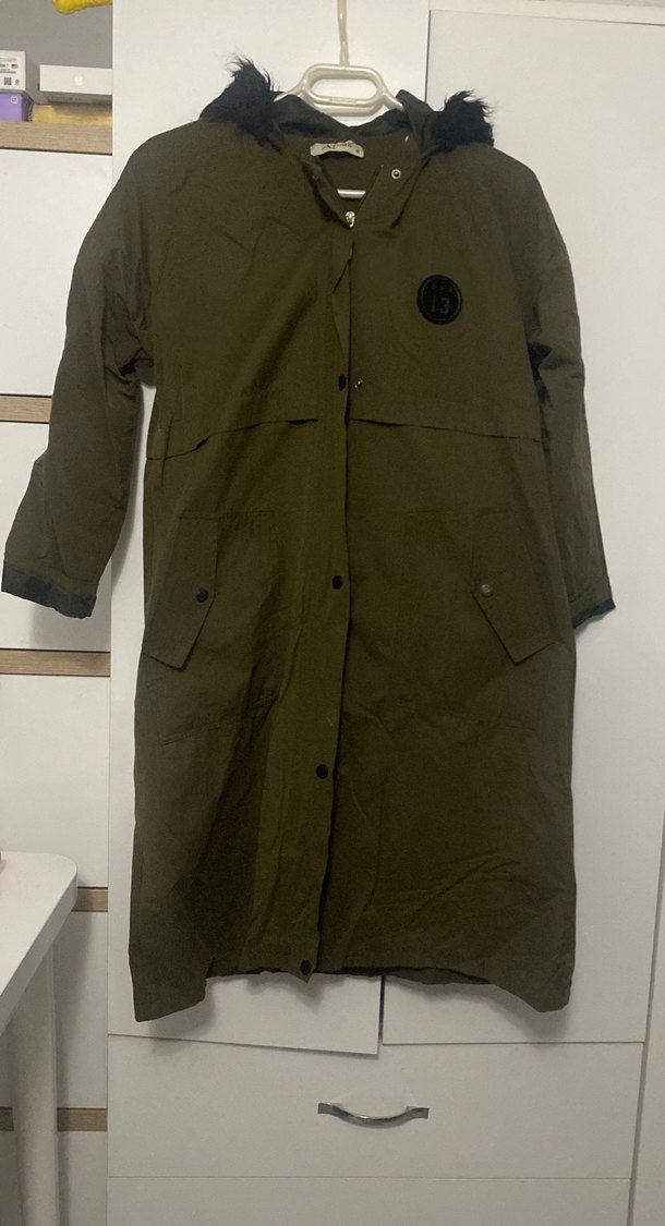 Kadınlar için uzun, haki renk düğmeli yağmurluk. Bol kesim, düğmeli kapama ve kesik yaka özelliklerine sahiptir. Yumuşak ve sıcak kumaştan üretilmiştir. Cebinde ufak kusuru var