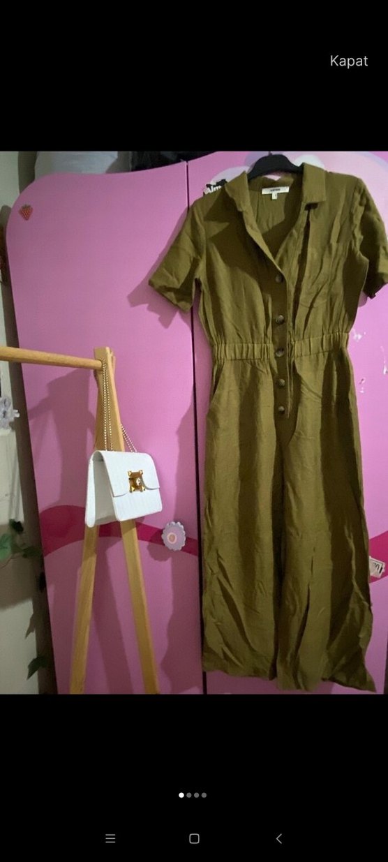 Düğmeli, kısa kollu, notched lapel yakalı, bol kesim uzun haki tulum. Minimalist sokak stili, günlük kullanıma uygun.