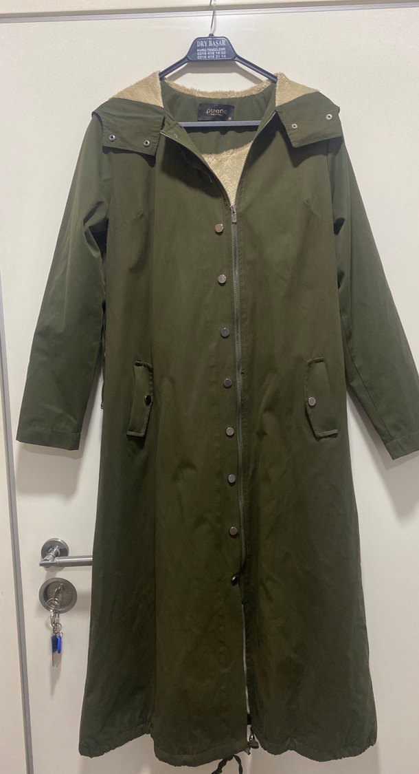 Kadınlar için bol kesim, uzun kollu, yakası çıtçıtlı haki yağmurluk. Sentetik kumaştan, parlak görünümlü, günlük kullanım için uygundur. ☔