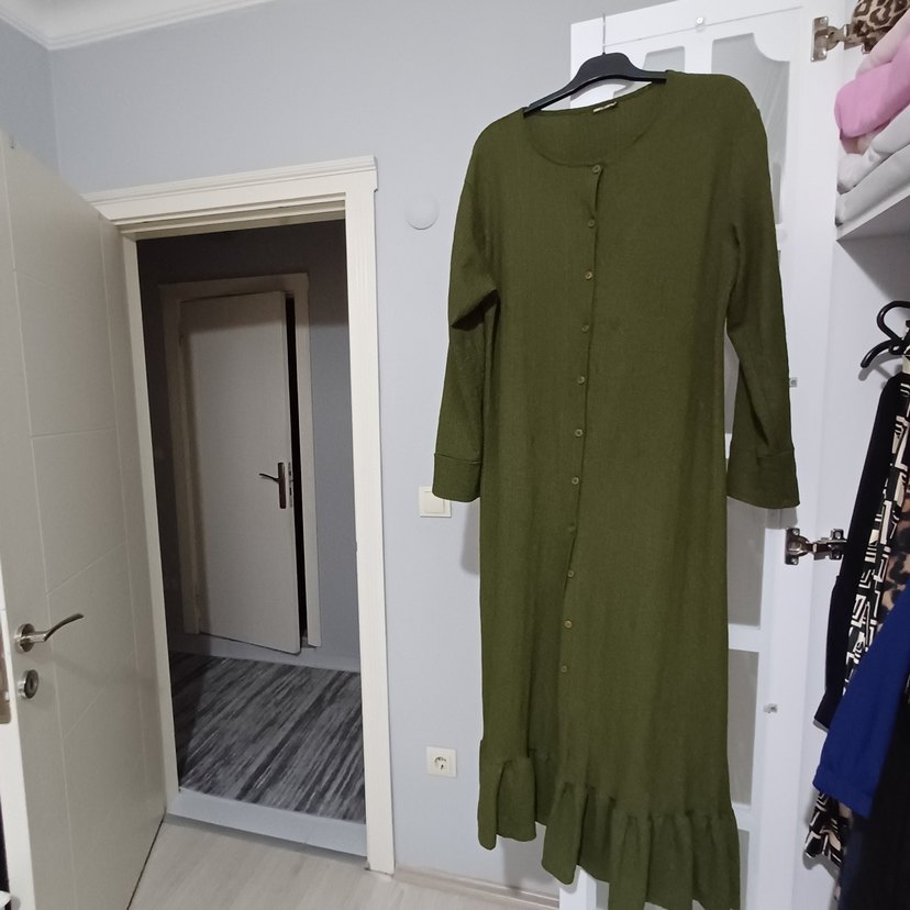 Kadınlar için uzun, bol kesim, uzun kollu elbise. Düğmeli ön, notlu yaka ve bohem stil ile koyu haki renkte, rahat ve sade tasarım. kolunda küçük bir kusuru var