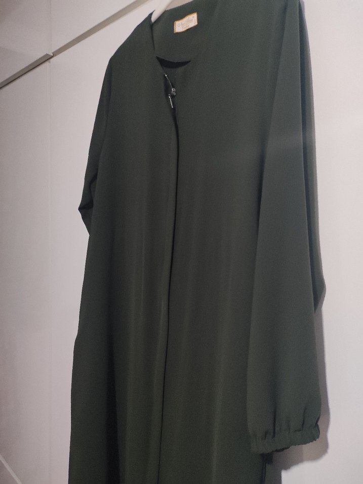 Koyu haki renkli, uzun, salaş kesim elbise. Drapeli detaylara ve yüksek yakaya sahip, uzun kollu, sade ve desensiz tasarım günlük kullanıma uygundur. cepli krep ferace