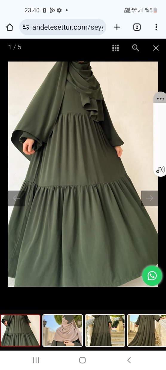 Kadınlar için yüksek yakalı, bol kesim ve fırfırlı detaylara sahip uzun elbise. Yumuşak sentetik kumaştan, koyu haki renkte, minimalist ve mütevazı tarz için uygundur. Ferace,tesettür