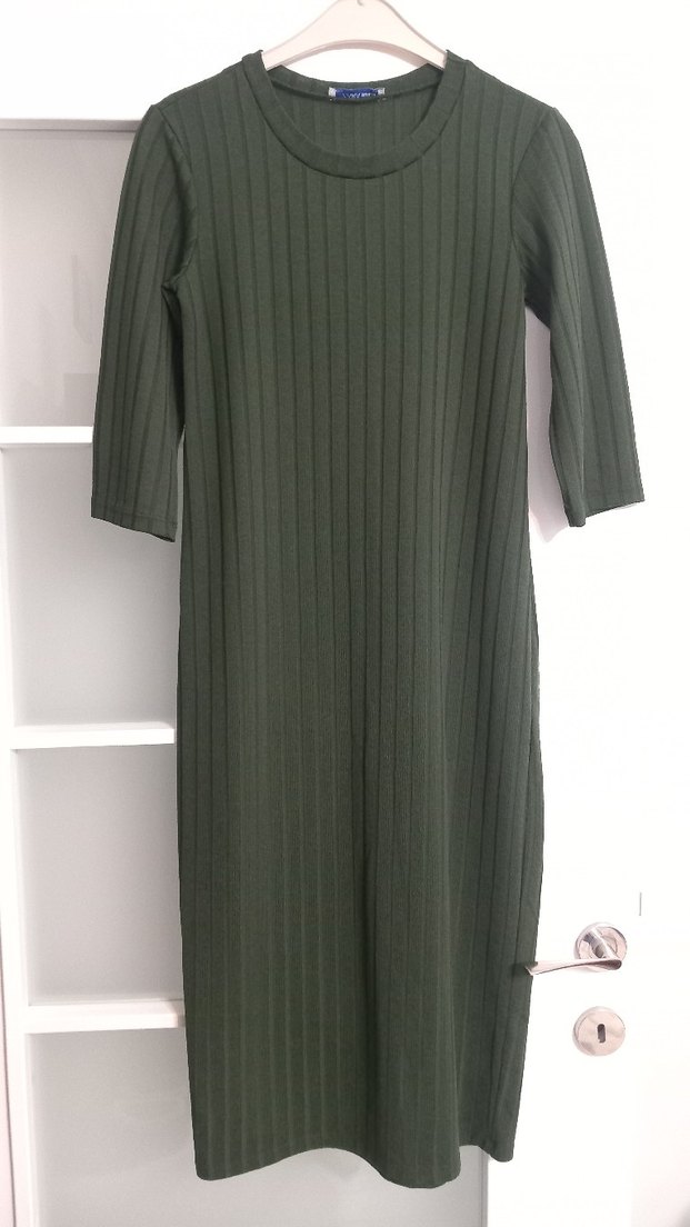 Kadın haki uzun elbise, üç çeyrek kollu tasarımıyla minimalist, günlük kullanıma uygun rahat bir stil sunar.