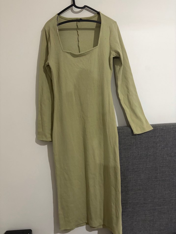 uzun ve fitted kesim haki renkli kadın elbise. Uzun kollu, kayık yaka ve drapeli detaylara sahip, minimalist tarzda günlük kullanıma uygun.