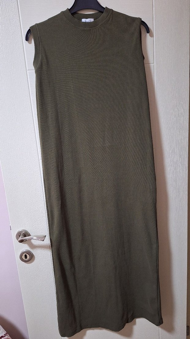 Kadınlar için uzun, fitilli ve kolsuz elbise. Likralı ribana kumaş, boğazlı yaka ve sade haki renkte, günlük kullanıma uygun. Standart bedendir. Boyu 1.35 fezzal giyimden alındı.