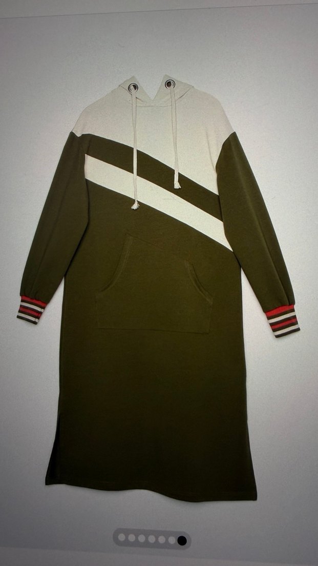 Kadınlar için uzun, bol kesim tunik. Uzun kollu, bisiklet yaka, haki ve gri renklerde, cepli ve çizgili manşetli. Sokak stili için uygun. Hiç giyilmedi sıfır ürün. Allday markasına ait 38 bedendir