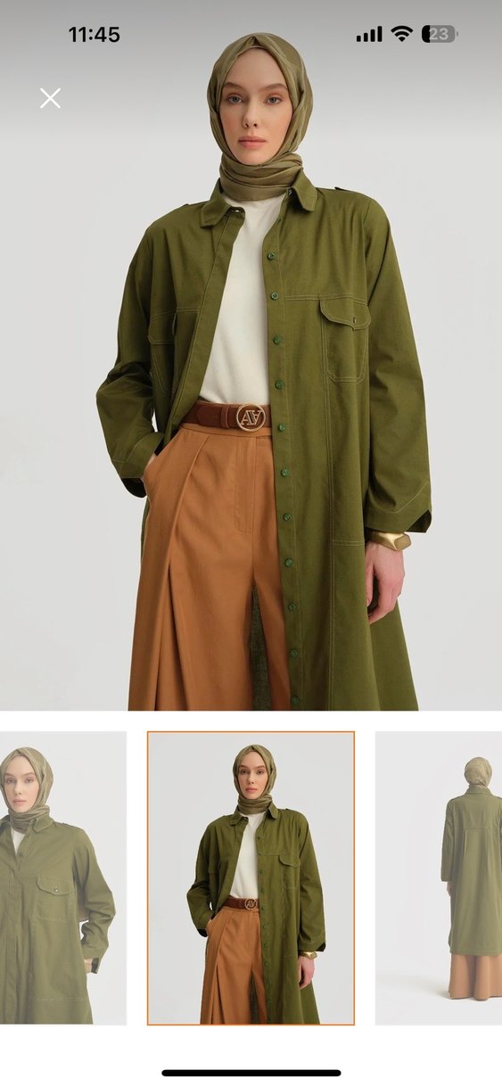 Kadınlar için uzun kesim, kemerli ve regular fit haki trençkot. Pamuk kumaştan, çıtçıtlı ve cepli, günlük kullanıma uygun. 44,46 uyumlu