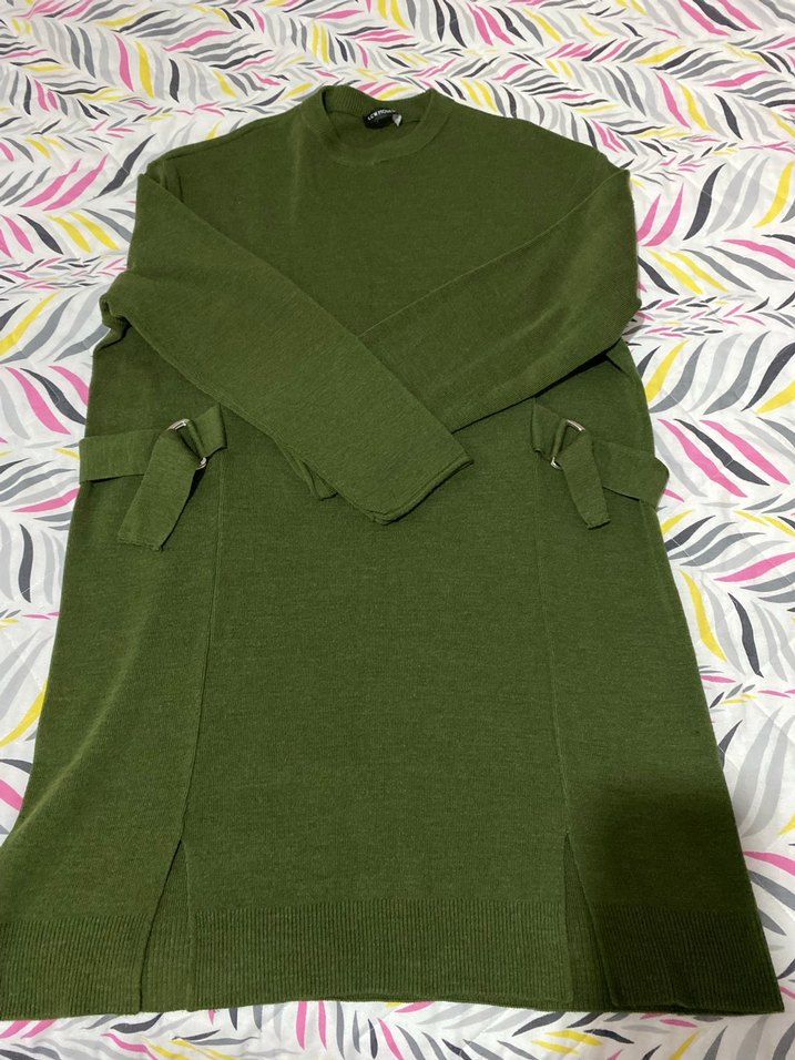 uzun, kemerli ve bol kesim triko kazak. Uzun kollu ve yuvarlak yakalıdır. Yumuşak kumaştan, günlük ve sokak stiline uygundur. M bedendir ancak esnektir yesyeni durumdadır 1 kez kullanıldı