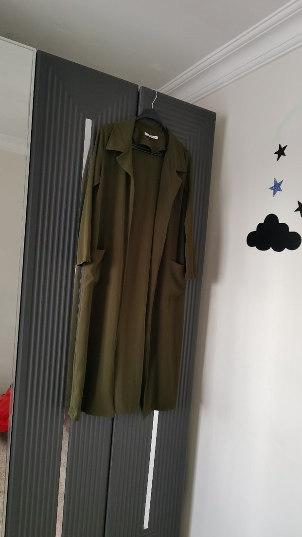 Kadınlar için uzun kesim, regular fit ve kesik yaka detaylı haki renkli trençkot. Sentetik kumaştan, uzun kollu ve salaş drapeli tasarıma sahip. Rengi kameradan açık çıktı bırz daha koyu yesil