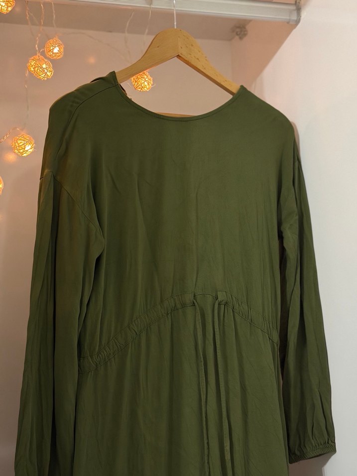 Kadınlar için haki renkte, keten kumaştan uzun ve bol kesim elbise. Drapeli detayları ve yuvarlak yakasıyla günlük kullanıma uygun bohem tarzda uzun kollu elbise.