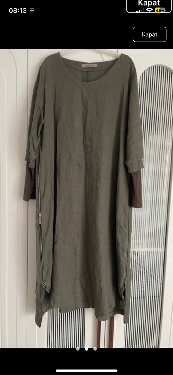 Haki renkli, uzun kollu, yuvarlak yaka ve keten kumaştan yapılmış bol salaş 46bedene kadar olır çok şık yeni gibi