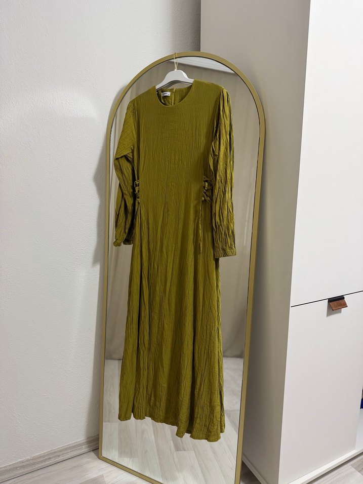 Kadınlar için keten kumaştan uzun, pileli ve bol kesim elbise. Uzun kollu, yuvarlak yakalı ve koyu haki renkte, minimalist bohem tarzda.(Şalı hediyedir)