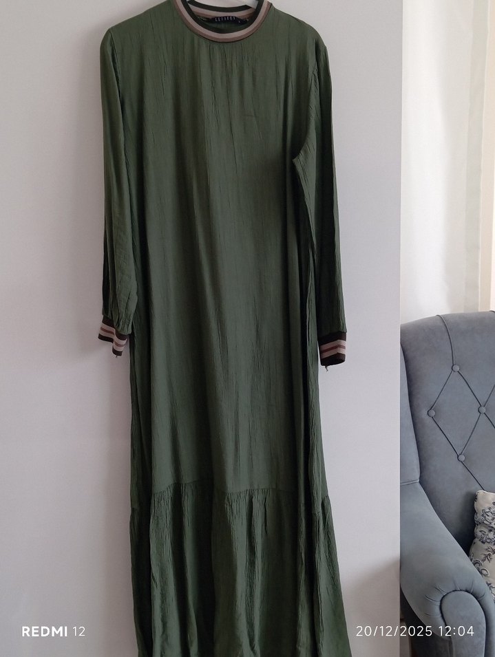 haki rengi uzun keten elbise, pileli detaylı ve bol kesimdir. Uzun kollu ve bisiklet yaka kol ve yakası ribanaılı çok şık ve zariftir