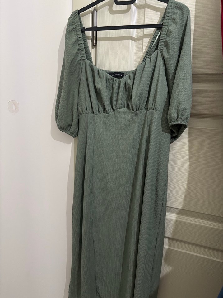 Hafif keten kumaştan yapılmış, drapeli ve tekne yakalı haki uzun midi elbise. İnce kesimli, yarım kollu ve minimal tarzda, günlük kullanıma uygun