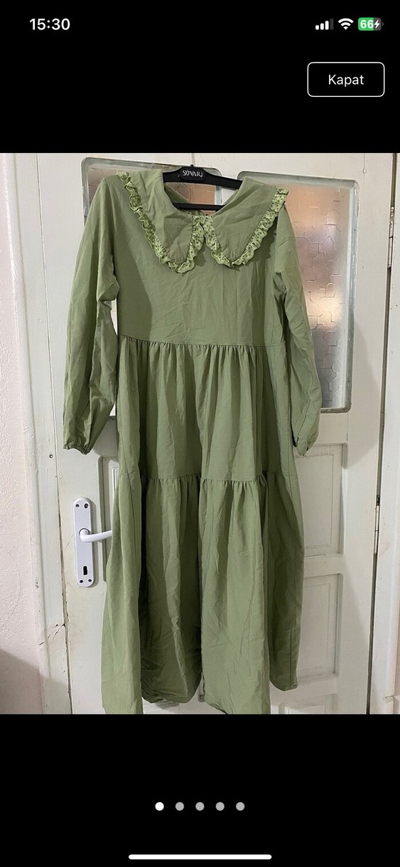 Kadın haki uzun keten elbise, bol kesim, yakalı ve fırfırlı detaylara sahiptir. Pastel tonlarda, bohem vintage tarzında, günlük kullanıma uygundur.