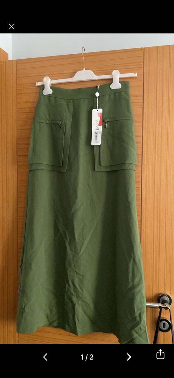 Kadınlar için haki renkte, keten kumaştan yapılmış uzun ve bol kesim etek. İki ön cepli, parlak ve minimalist sokak stiliyle günlük kullanıma uygun.