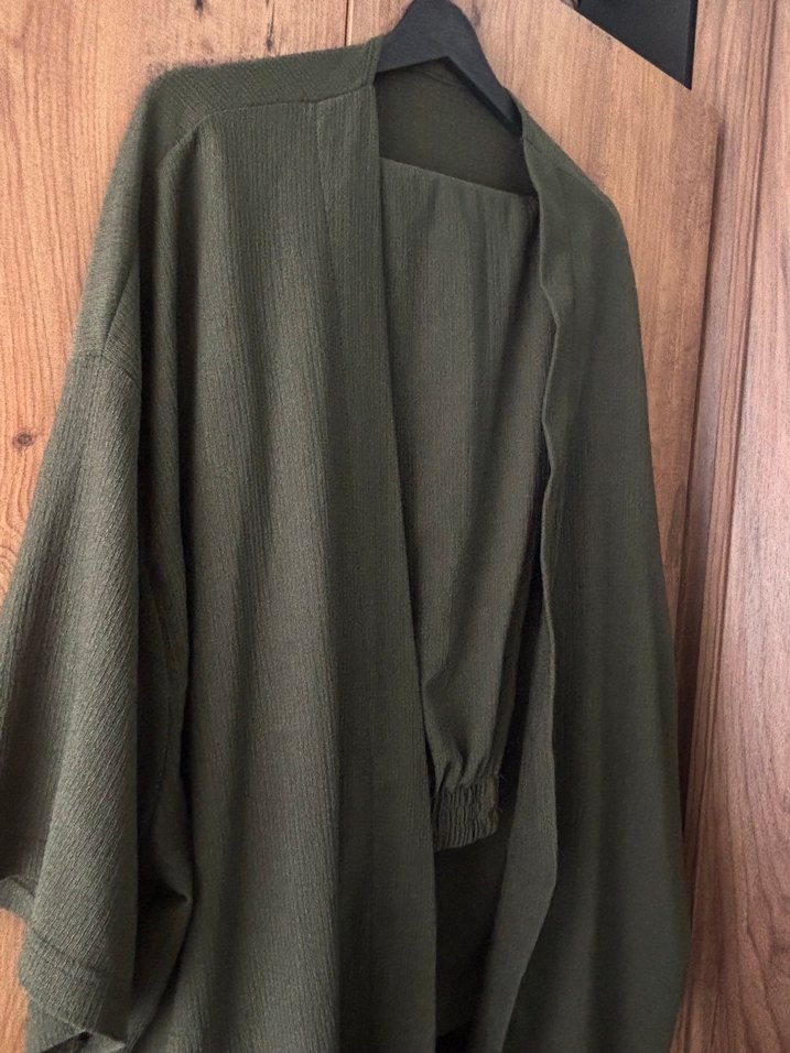 Kadınlar için müslin kumaştan, bol kesim, haki renk bilek kollu ve yakası kesimli kimono. Rahat ve bohem tarz için ideal. 44/48 bedene kadar uyumlu. Oversize gibi.