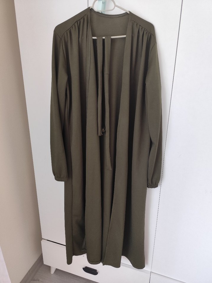 Kadınlar için uzun, haki renk keten pardösü. Salaş kesimli, drapeli ve uzun kollu. Minimalist, basic tarzda, günlük kullanıma uygun.
