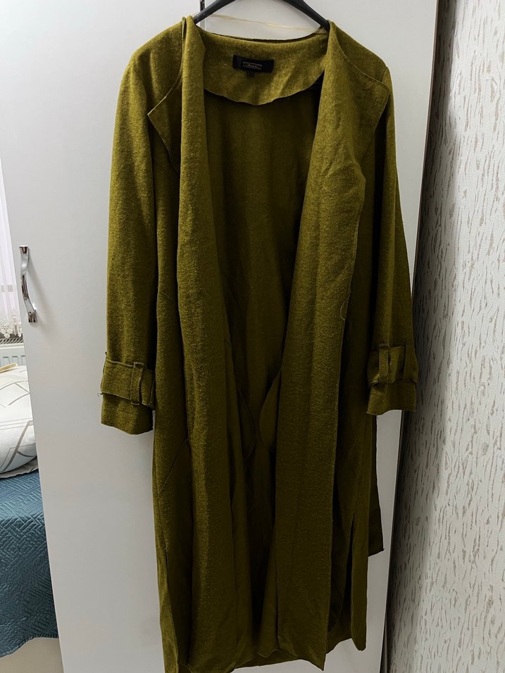Kadınlar için uzun, keten kumaştan salaş kesim trençkot. Drapeli tasarım, kesik yaka ve uzun kolludur. Haki renginde, günlük rahat tarz için uygundur.