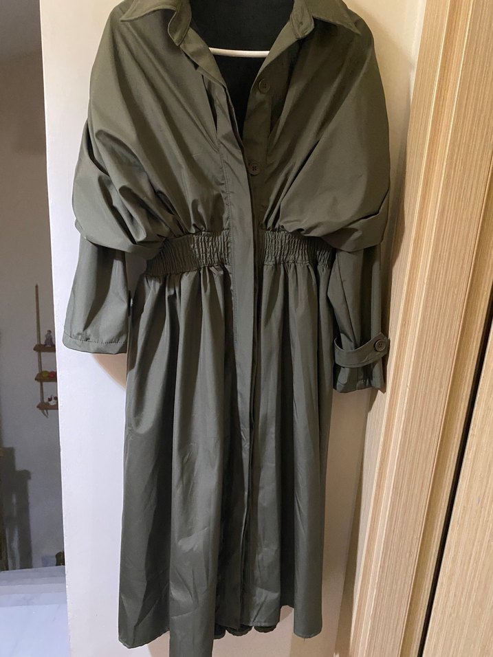 Uzun, haki renk keten kumaştan yapılmış, salaş kesim ve drapeli detaylara sahip trençkot. Notlu yakası ve uzun kolları ile günlük şehir stiline uygun, Parisli avant-garde havasında.