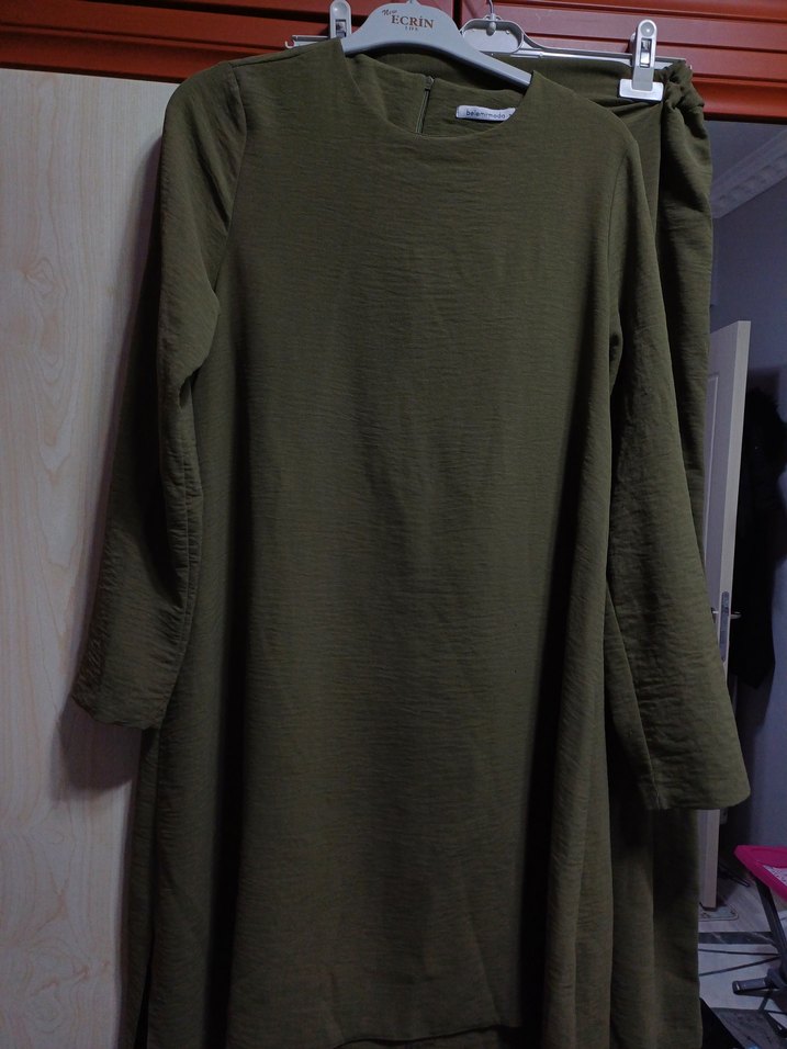 Kadınlar için uzun, salaş kesimli keten tunikve pantolon Haki renginde, yuvarlak yakalı, uzun kollu ve dökümlü tasarıma sahip. Minimalist ve sade stil, günlük kullanım için uygun.