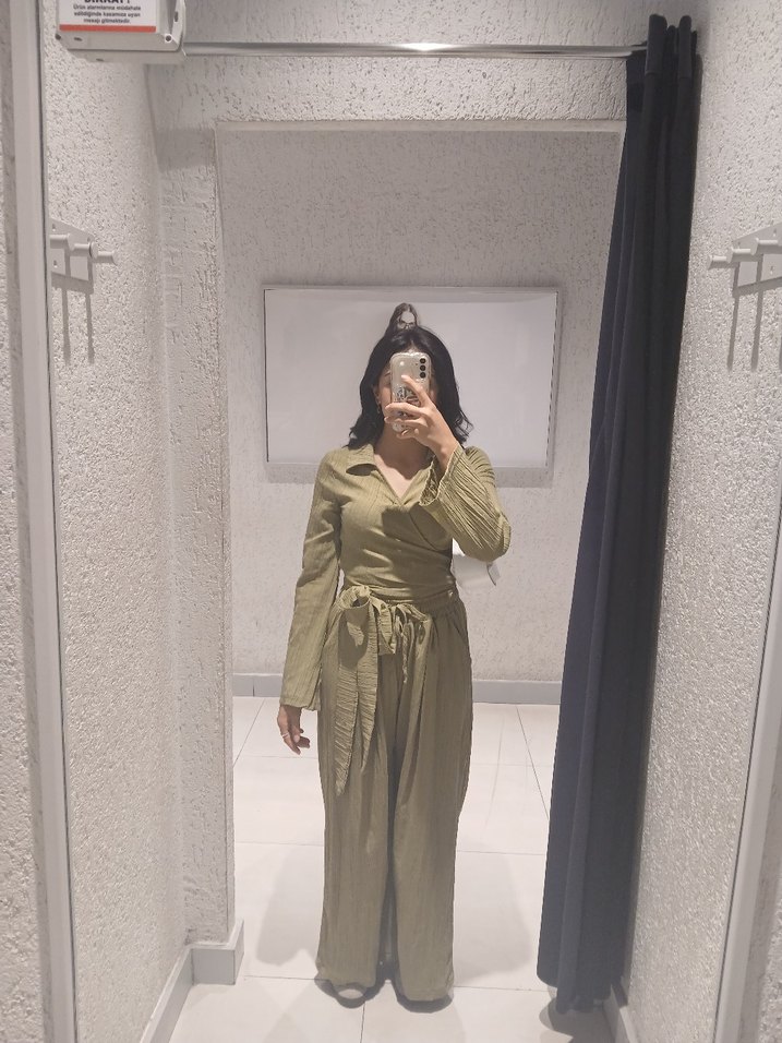 Haki renkli, keten kumaştan uzun ve bol kesim takım . Uzun kollu ve V yakalı, minimal tasarımıyla günlük kullanım için rahat ve şık. sadece denendi kullanılmadı