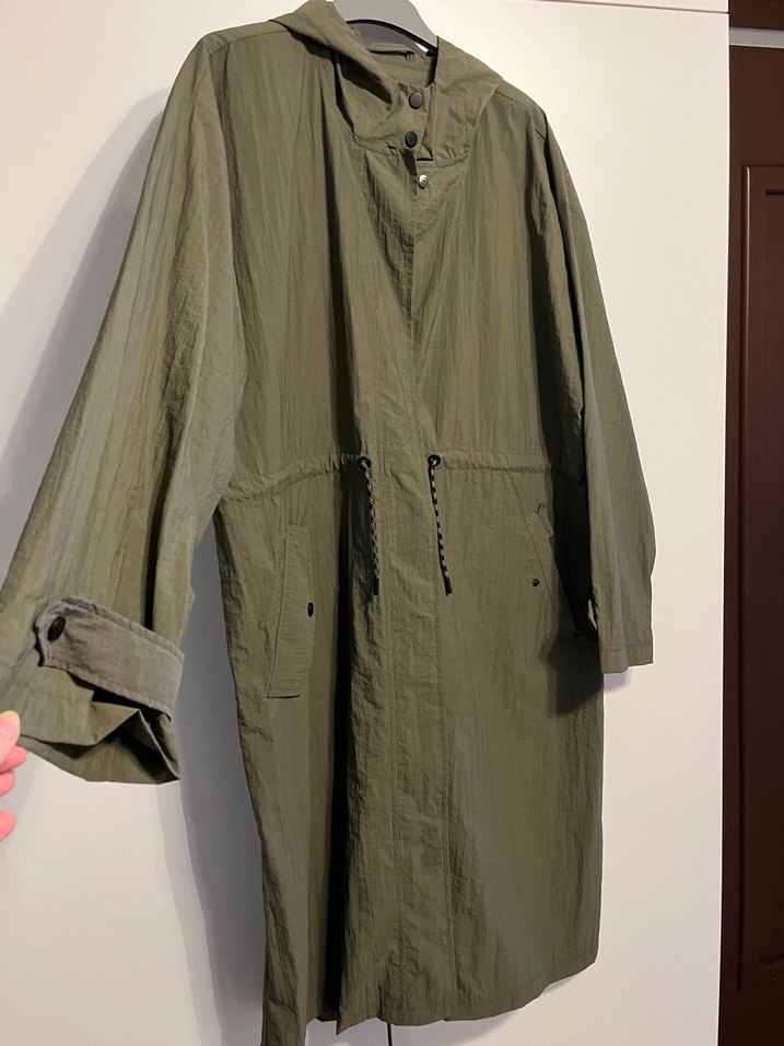 Kadinlar için haki renk uzun keten trençkot, düğmeli ve geniş kesim. Notlu yaka ve cep detayları ile sokak stiline uygun.