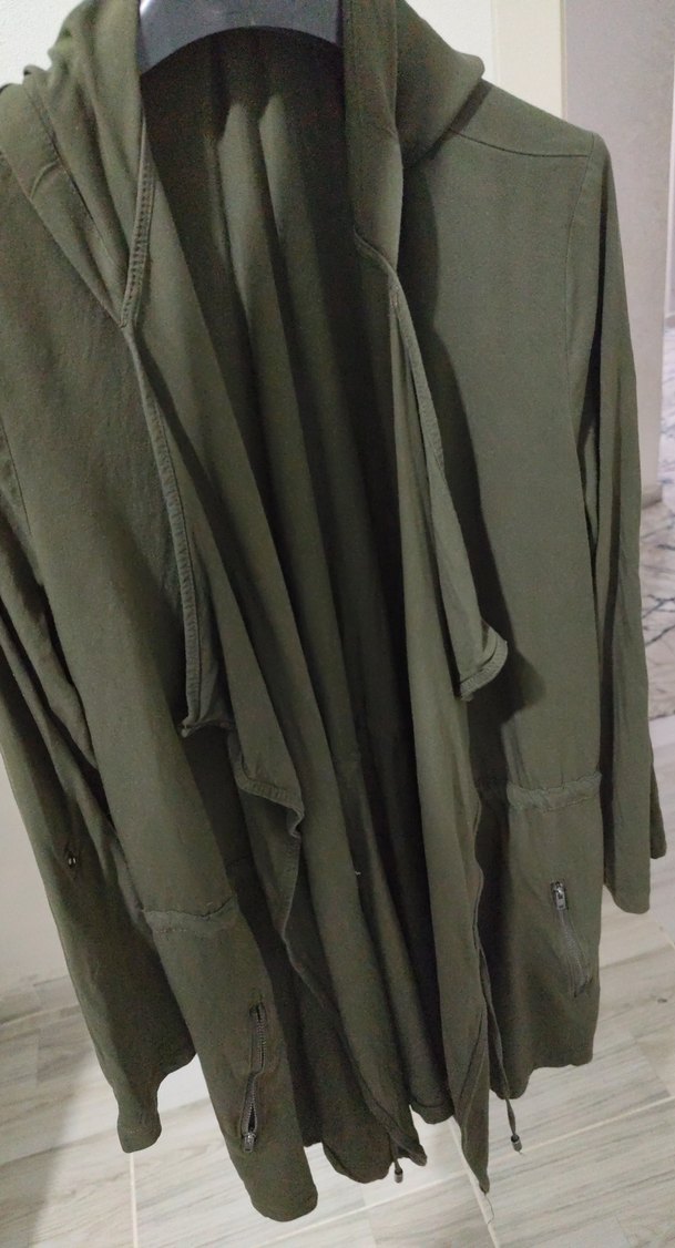 Kadın keten kumaştan, bol kesim ve uzun kollu haki renkli trençkot. Dökümlü tasarımı ve keskin yaka detayıyla günlük sokak stiline uygundur.