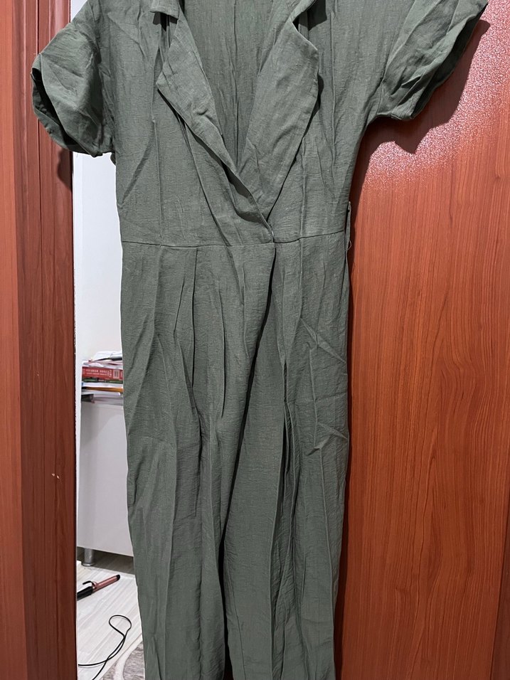 Kadın keten tulum, bol kesim ve drapeli tasarıma sahiptir. Notlu yaka, kısa kollu ve bohem stilde, haki renkte ve desensizdir.