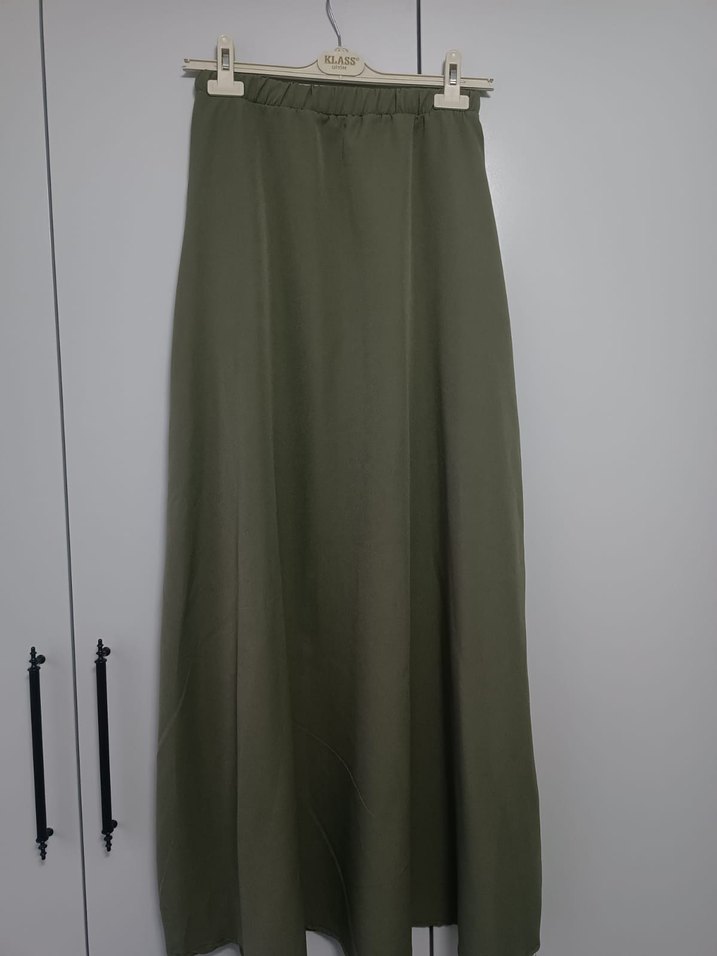 Kadın haki renk uzun, salaş kesim ve drapeli tasarıma sahip, yumuşak sentetik kumaştan üretilmiş etek, günlük kullanıma uygundur.