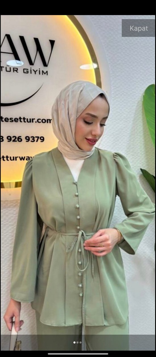 Haki renkli, uzun boy, uzun kollu ve etnik desenli kadın kap. Belde bağlama detaylı, rahat kesim ve minimalist tarzda.