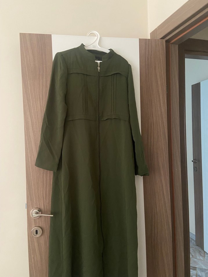 Haki renkli, uzun kollu, fermuarlı bu uzun elbise düz desene sahiptir. Günlük kullanıma uygun, sade ve rahat bir modeldir. 40 beden ama 38 bedenede olur