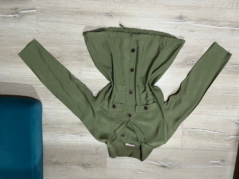 Kadın haki keten gömlek bol kesim, uzun kollu ve yakası kesik detaylıdır. Düğme detayları ve uzun boyu ile günlük sokak stiline uygundur.