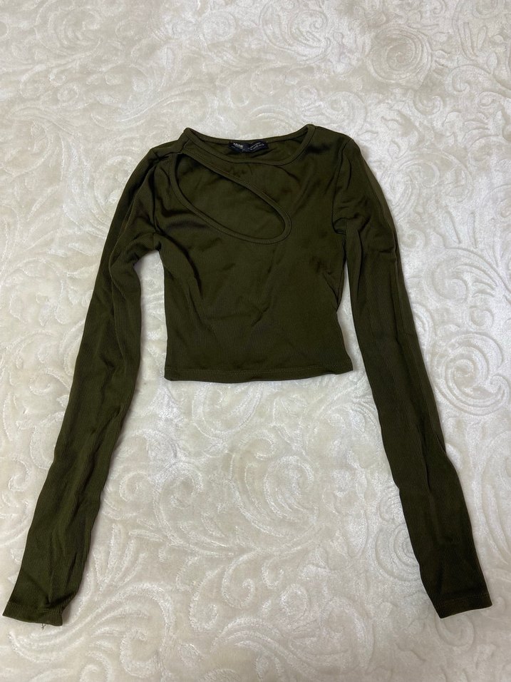 Kadınlar için haki renkli, uzun kollu ve kruvaze yaka detaylı, yumuşak sentetik kumaştan üretilmiş, normal midi boyda ve yırtmaçlı basic bluz.