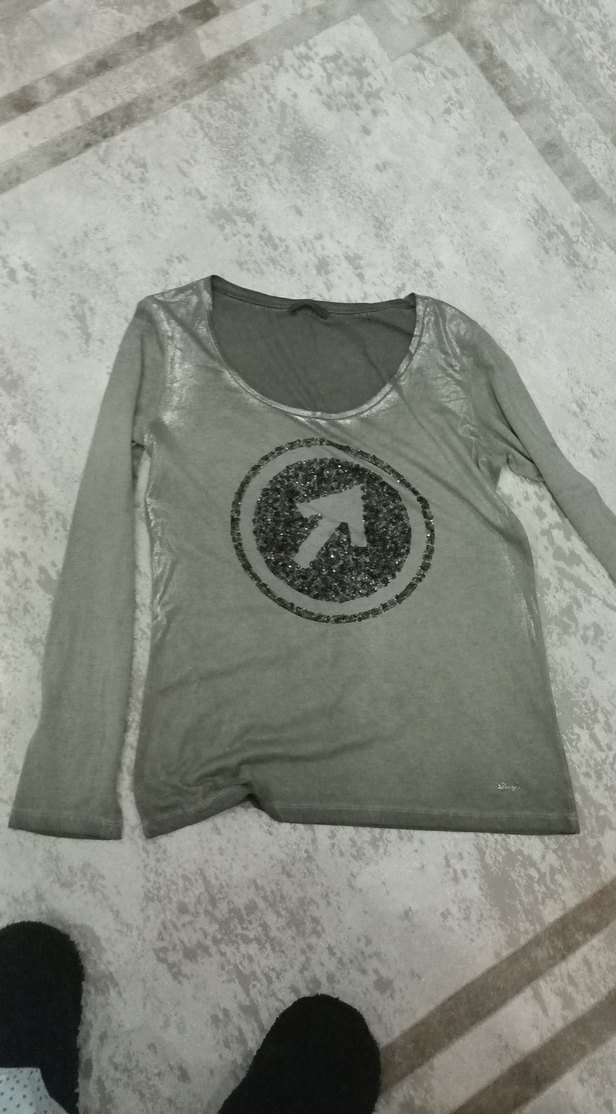 Kadın haki uzun kollu tişört, yuvarlak yaka ve önünde baskılı desen bulunur. Rahat kesimli ve yumuşak sentetik kumaştan, günlük sokak stili için uygundur.