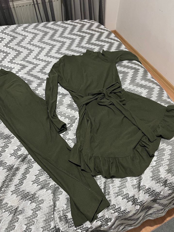 Kadınlar için haki renkli, uzun ve beli kuşaklı takım