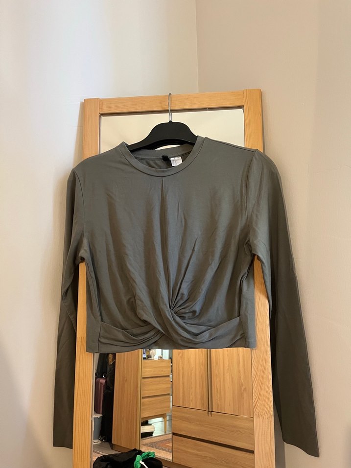 Haki renkte, uzun kollu, yuvarlak yaka ve önde drapeli detaylı crop top. Kadınlar için vücuda oturan, yumuşak kumaştan rahat bir parça.