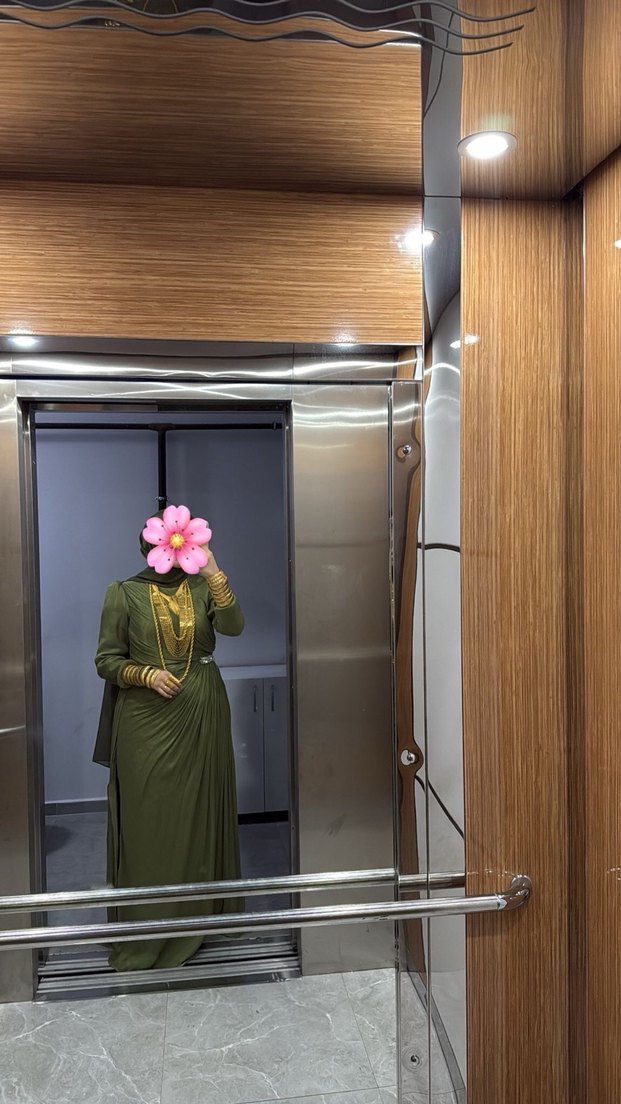 Uzun kollu, yüksek yakalı ve drapeli tasarıma sahip, koyu haki çiçek desenli, fitted kadın elbisesi, düğün için uygundur.