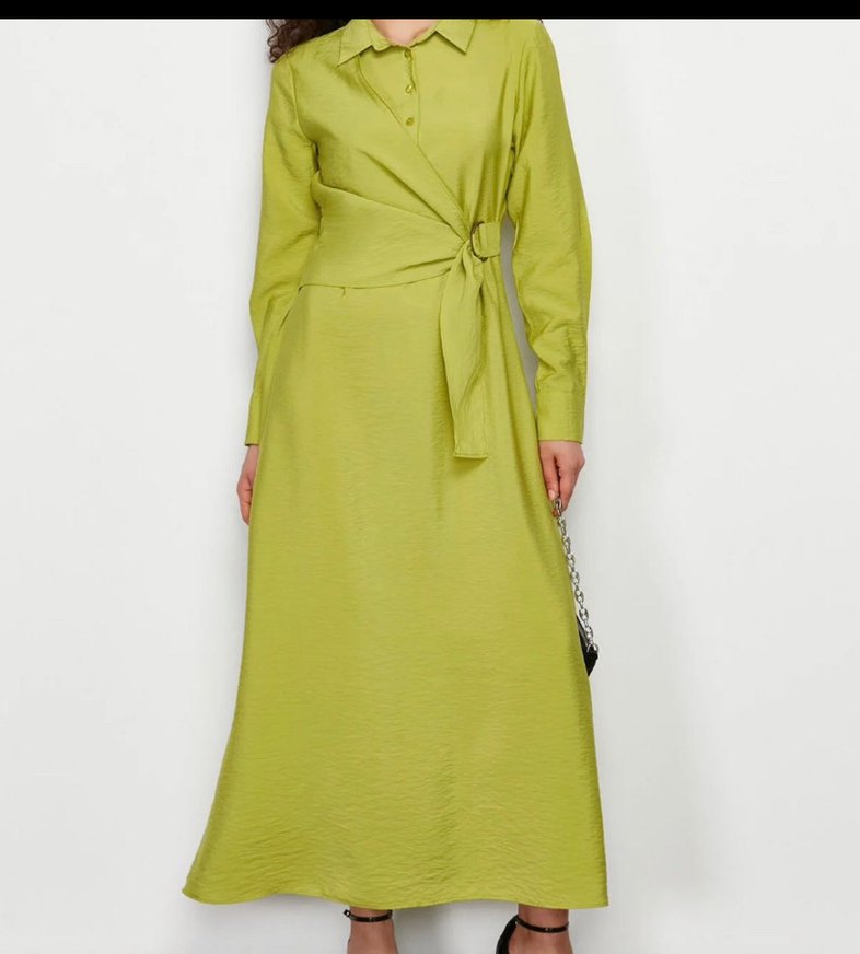 Haki uzun kollu, yakalı, sentetik kumaştan yapılmış, drapeli ve belden bağlamalı, ofis için uygun rahat kesim elbise.