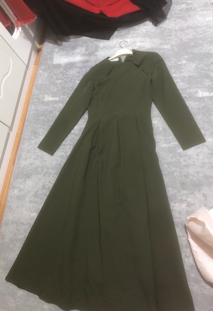 Kadınlar için koyu haki renkte, drapeli ve yakalı uzun kollu elbise. Sentetik kumaştan, ofis için uygun, rahat ve şık kesim.