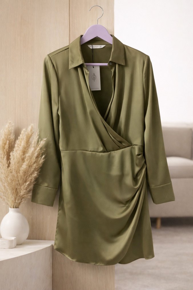 Haki renkli, v yaka ve uzun kollu drapeli kadın mini elbisesi.parlak dokusu ile ofis,gece ve günlük kullanıma uygundur. M beden ama dar ve kısa olduğu için S daha uygundur.